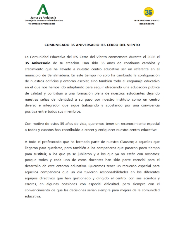 COMUNICADO 35 ANIVERSARIO IES CERRO DEL VIENTO