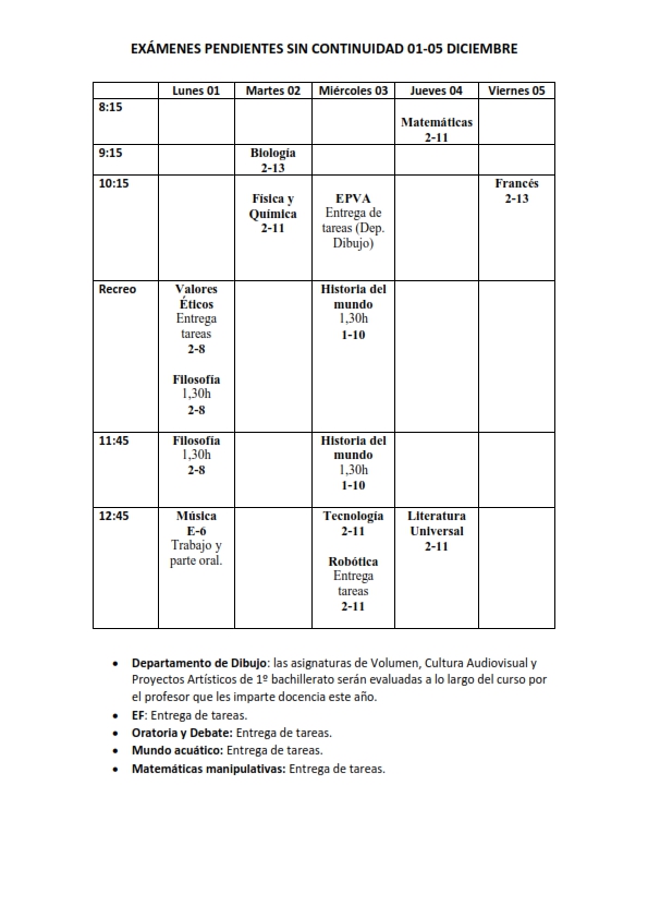 Exámenes de pendientes sin continuidad , del 1 al 5 de diciembre